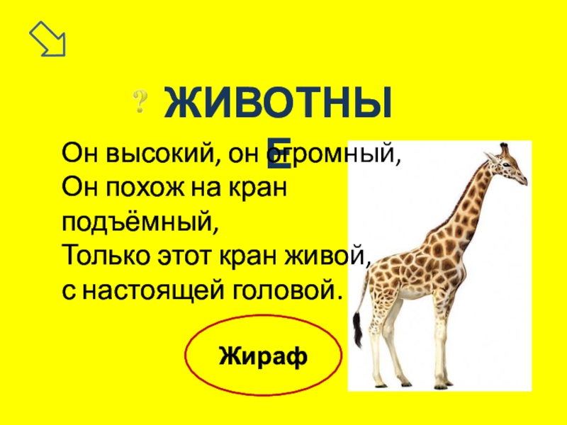 ЖИВОТНЫЕЖирафОн высокий, он огромный, Он похож на кран подъёмный, Только этот кран живой, с настоящей головой.