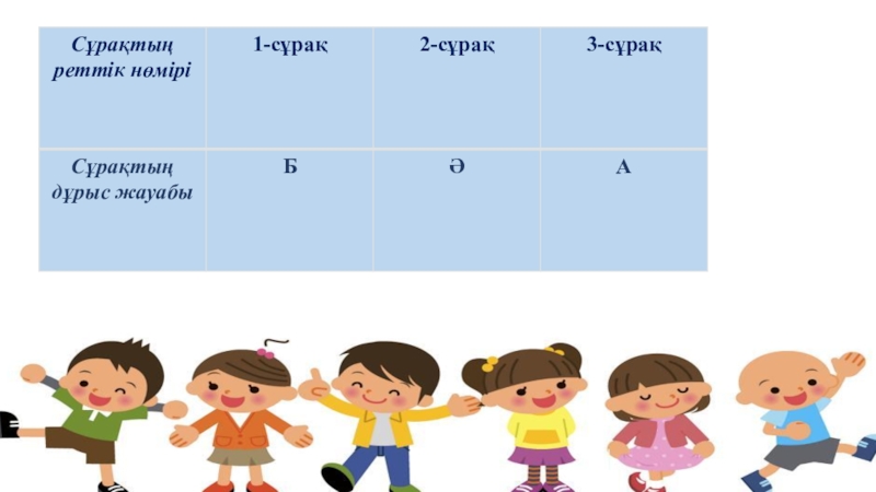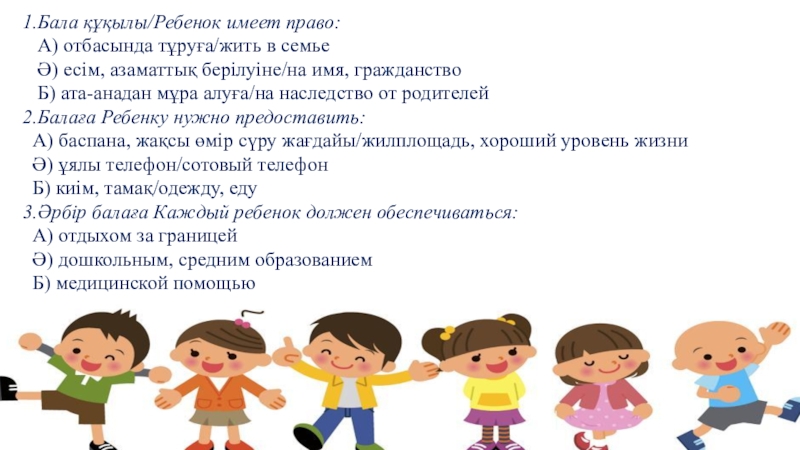 1.Бала құқылы/Ребенок имеет право:  А) отбасында тұруға/жить в семье  Ә) есім, азаматтық берілуіне/на имя, гражданство