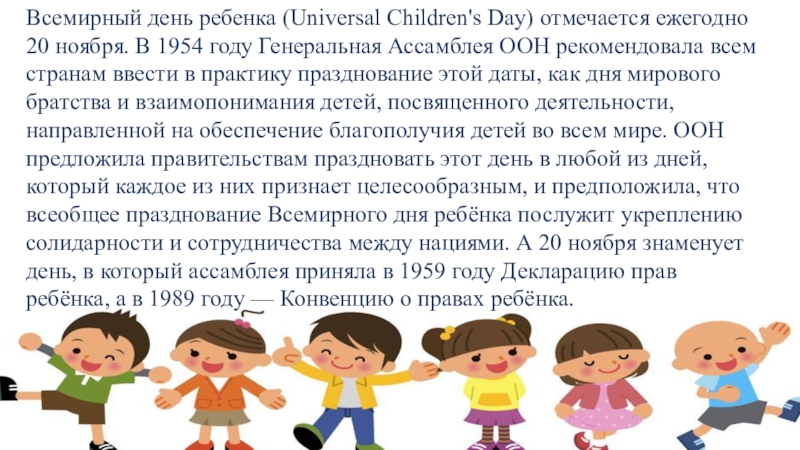 Слайд 2Всемирный день ребенка (Universal Children's Day) отмечается ежегодно 20 ноября. В