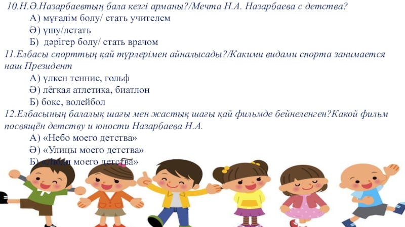 Слайд 28 10.Н.Ә.Назарбаевтың бала кезгі арманы?/Мечта Н.А. Назарбаева с детства?