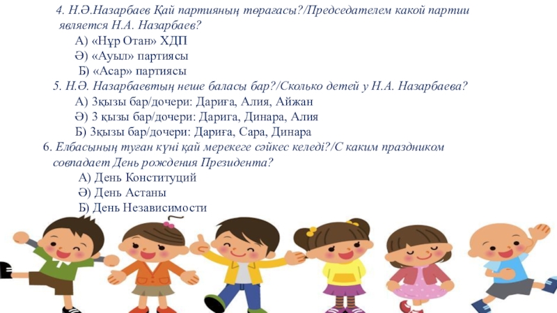 5. Н.Ә. Назарбаевтың неше баласы бар?/Сколько детей у Н.А. Назарбаева?