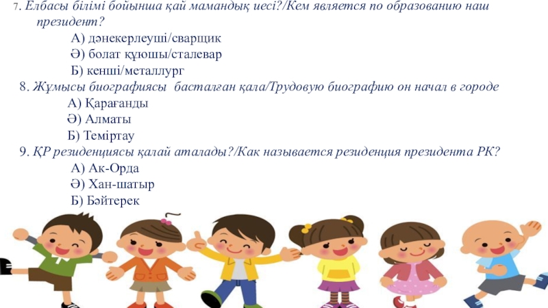 7. Елбасы білімі бойынша қай мамандық иесі?/Кем является по образованию наш