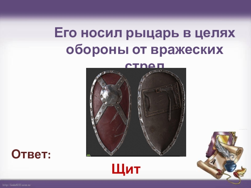 Его носил рыцарь в целях обороны от вражеских стрел  Щит Ответ: