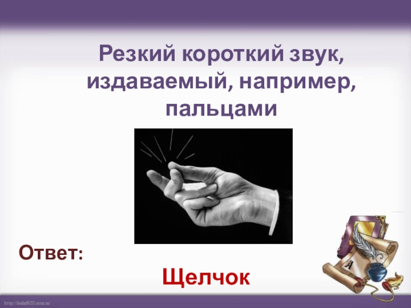 Слайд 10Резкий короткий звук, издаваемый, например, пальцами