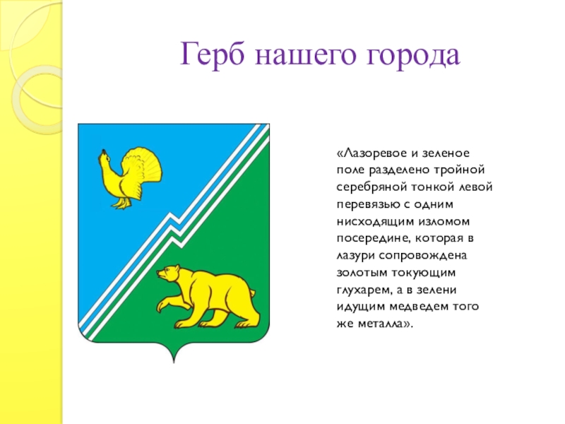 перевязью с одним нисходящим изломом посередине, которая в лазури сопровождена золотым токующим глухарем, а в зелени идущим медведем того же металла».