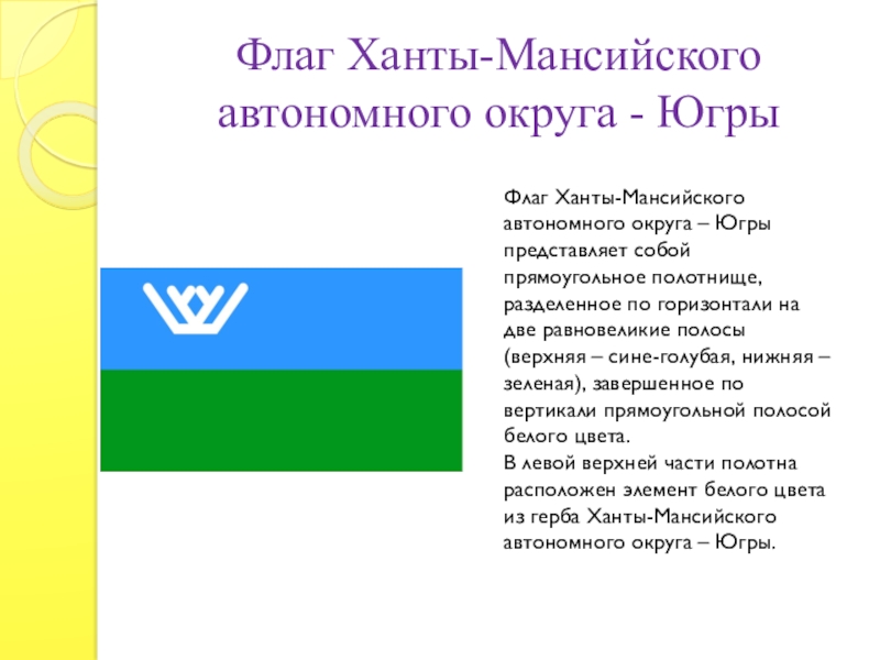 Флаг Ханты-Мансийского автономного округа - ЮгрыФлаг Ханты-Мансийского автономного округа – Югры представляет собой прямоугольное полотнище, разделенное по горизонтали