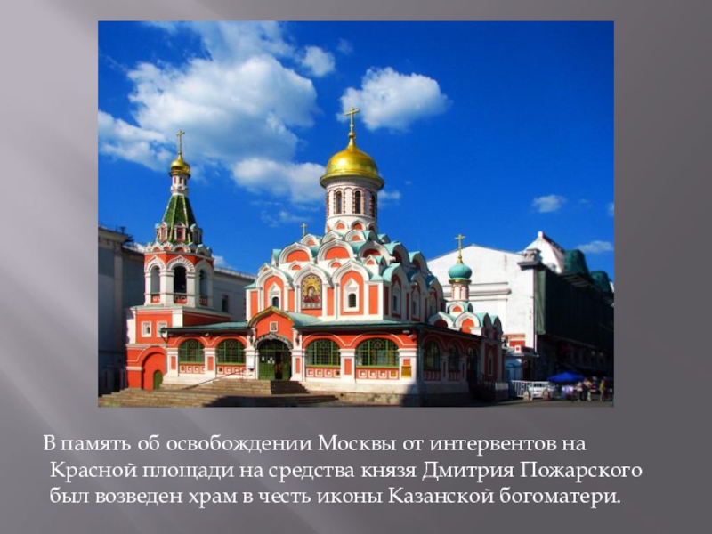 Красной площади на средства князя Дмитрия Пожарского был возведен храм в честь иконы Казанской богоматери.