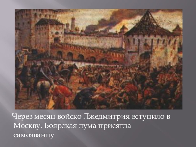 Слайд 6 Через месяц войско Лжедмитрия вступило в Москву. Боярская дума присягла самозванцу