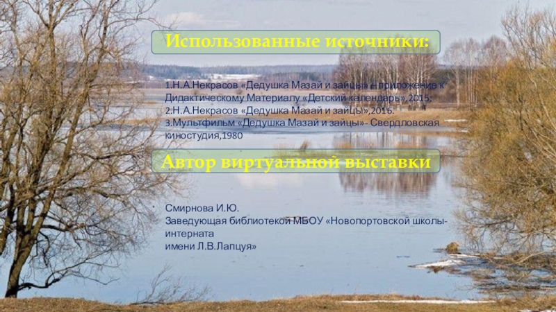 Использованные источники:Автор виртуальной выставкиСмирнова И.Ю.Заведующая библиотекой МБОУ «Новопортовской школы-интернатаимени Л.В.Лапцуя»1.Н.А.Некрасов «Дедушка Мазай и зайцы» – приложение к
