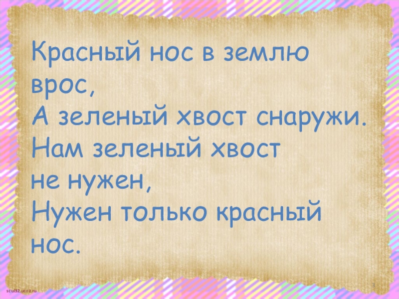 Красный нос в землю врос, А зеленый хвост снаружи.Нам зеленый хвост не нужен, Нужен только красный нос.
