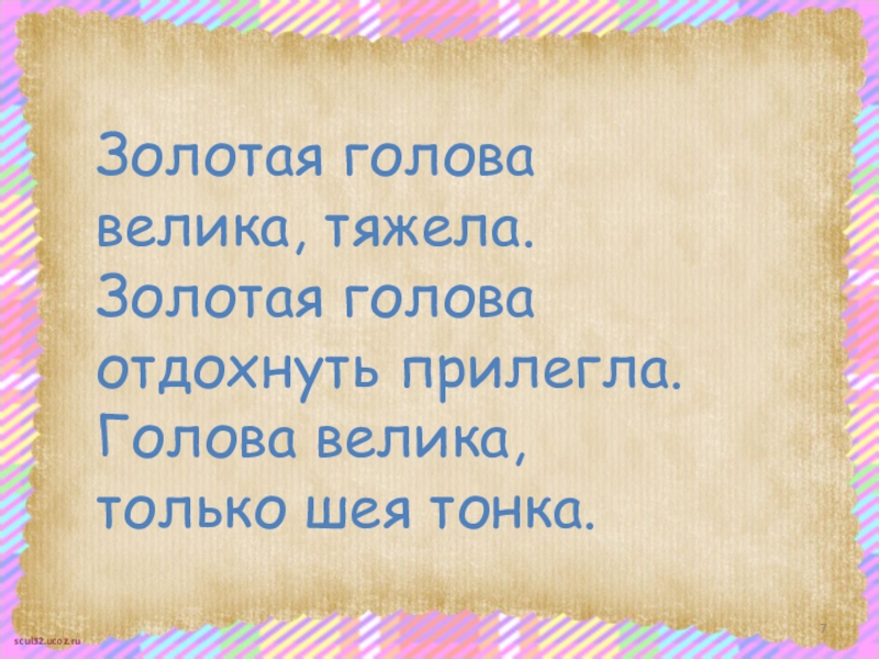 Золотая голова велика, тяжела.Золотая голова отдохнуть прилегла.Голова велика, только шея тонка.
