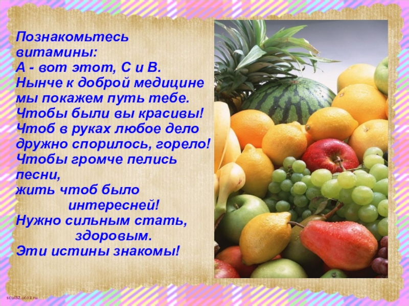 Познакомьтесь витамины: А - вот этот, С и В.Нынче к доброй медицине мы покажем путь тебе.Чтобы были