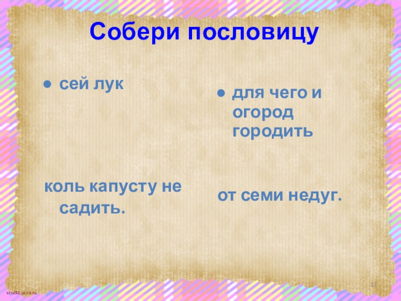сей лукот семи недуг.коль капусту не садить.для чего и огород городитьСобери пословицу