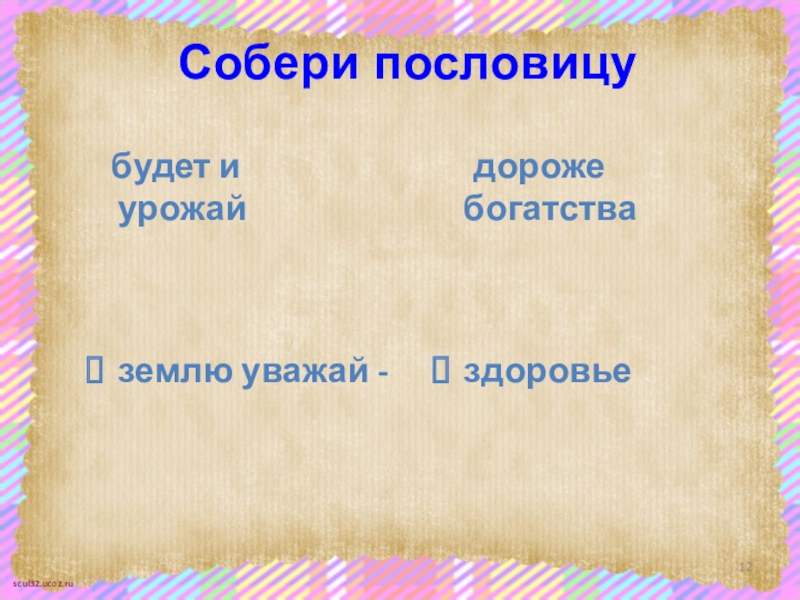 будет и урожай	дороже богатстваземлю уважай -здоровьеСобери пословицу