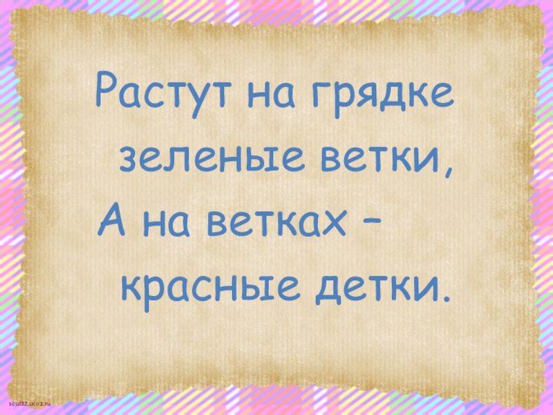 Растут на грядке зеленые ветки,А на ветках – красные детки.