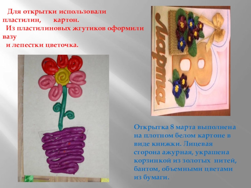 Для открытки использовали пластилин, картон.