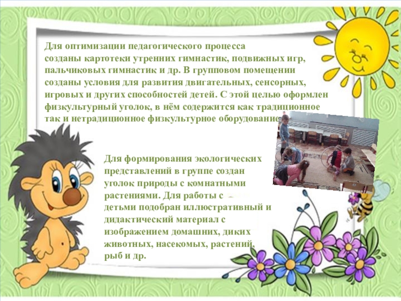 Для формирования экологических представлений в группе создан уголок природы с комнатными растениями. Для работы с детьми подобран иллюстративный и дидактический материал с изображением домашних, диких животных, насекомых, растений, рыб и др.