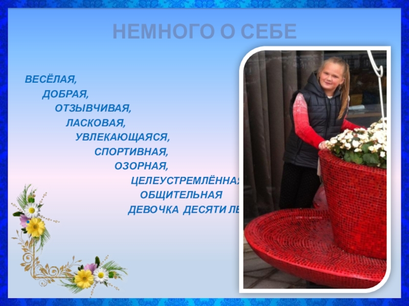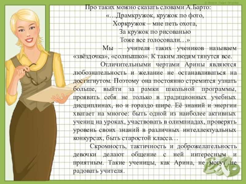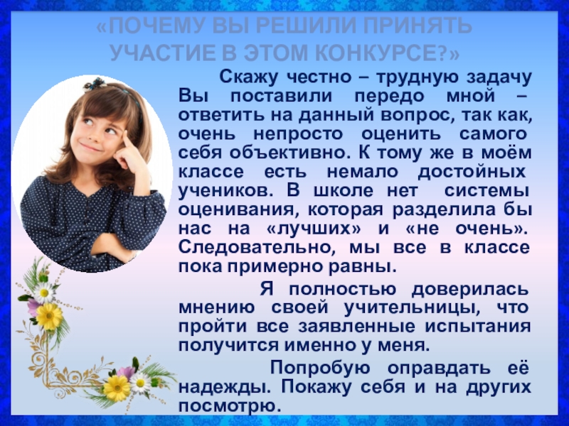 честно – трудную задачу Вы поставили передо мной – ответить на данный вопрос, так как, очень непросто оценить самого себя объективно. К тому же в моём классе есть немало достойных учеников. В школе нет системы оценивания, которая разделила бы нас на «лучших» и «не очень». Следовательно, мы все в классе пока примерно равны.