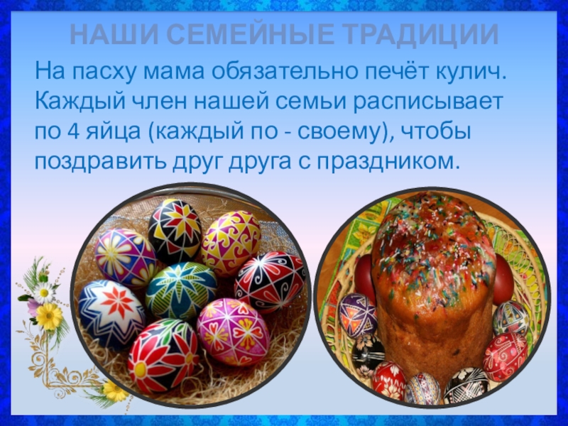 семьи расписывает по 4 яйца (каждый по - своему), чтобы поздравить друг друга с праздником.