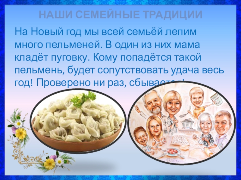 В один из них мама кладёт пуговку. Кому попадётся такой пельмень, будет сопутствовать удача весь год! Проверено ни раз, сбывается!