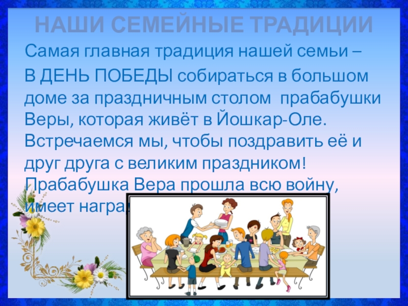 собираться в большом доме за праздничным столом прабабушки Веры, которая живёт в Йошкар-Оле. Встречаемся мы, чтобы поздравить её и друг друга с великим праздником! Прабабушка Вера прошла всю войну, имеет награды!