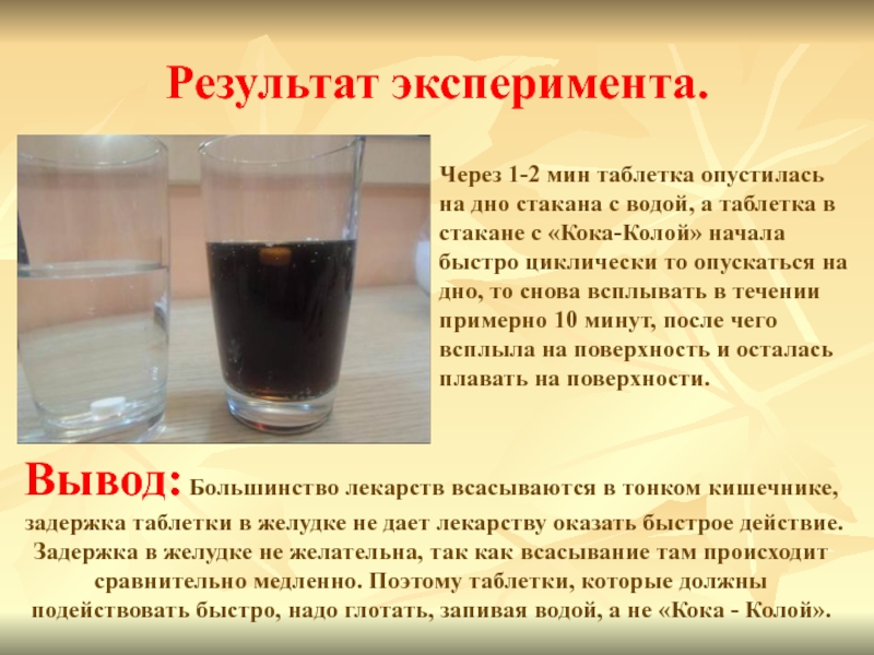 Вывод: Большинство лекарств всасываются в тонком кишечнике, задержка таблетки в желудке не дает лекарству оказать быстрое действие. Задержка в желудке не желательна, так как всасывание там происходит сравнительно медленно. Поэтому таблетки, которые должны подействовать быстро, надо глотать, запивая водой, а не «Кока - Колой».
