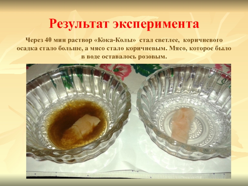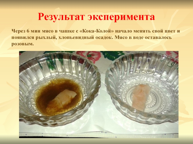 воду (для сравнения), а в другой образец мяса добавила «Кока-Колы».