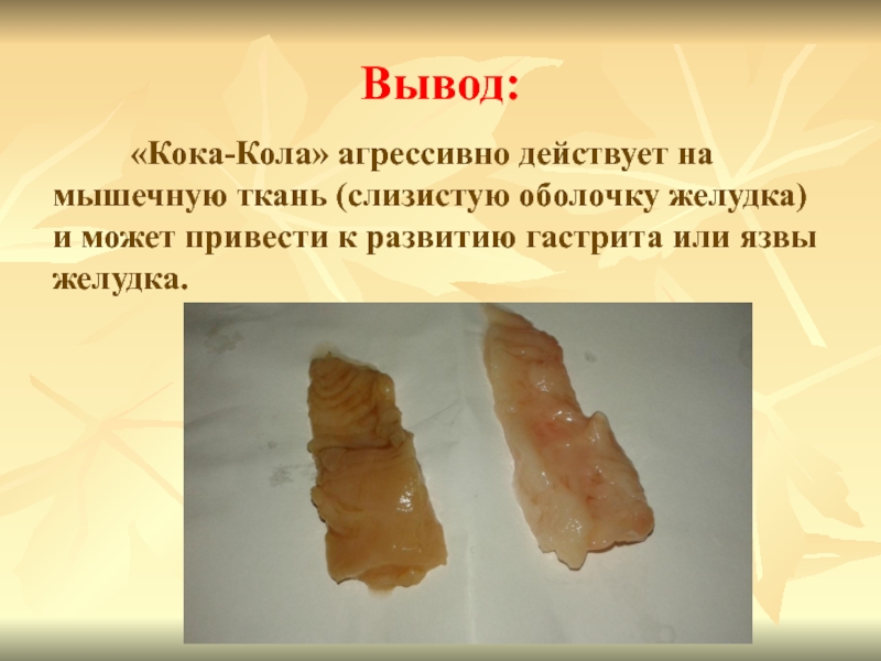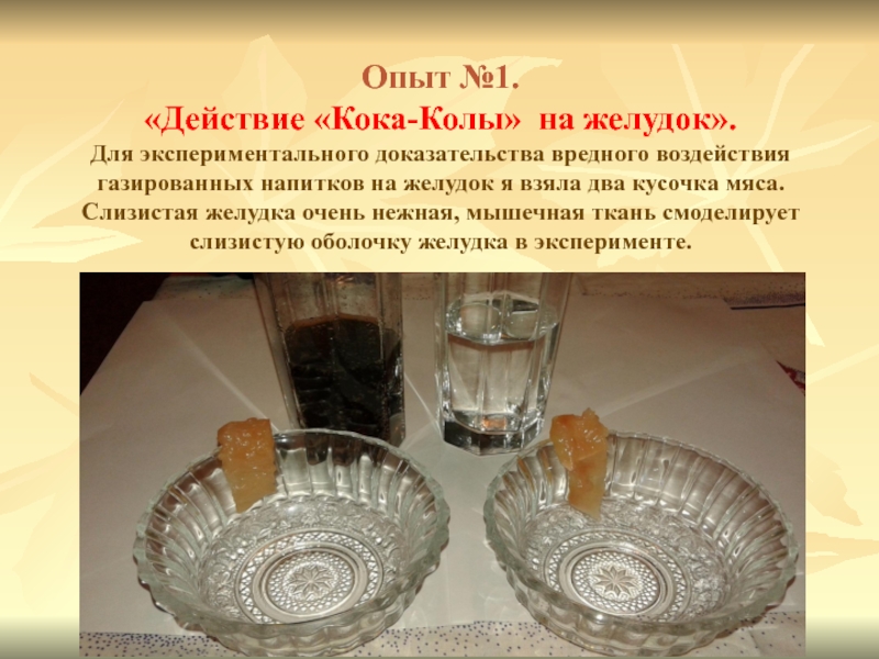 газированных напитков на желудок я взяла два кусочка мяса. Слизистая желудка очень нежная, мышечная ткань смоделирует слизистую оболочку желудка в эксперименте.
