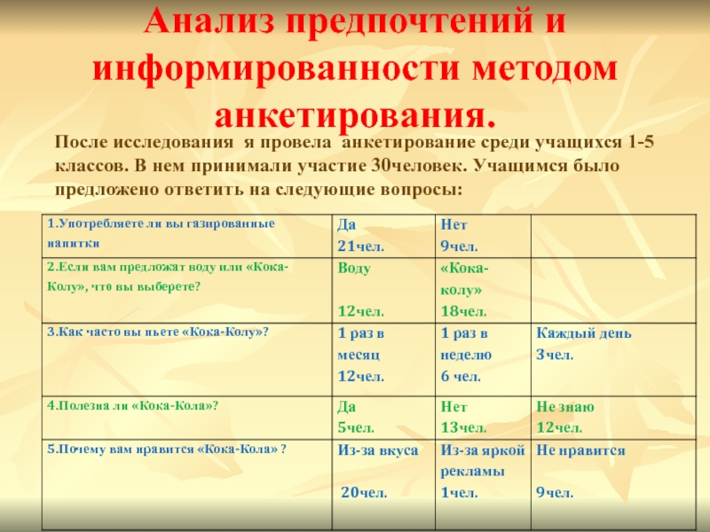 Слайд 26Анализ предпочтений и информированности методом анкетирования.