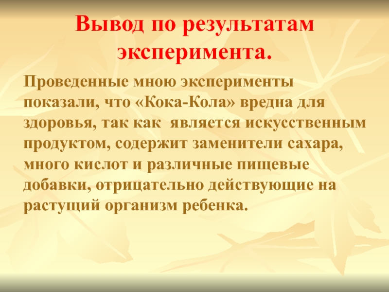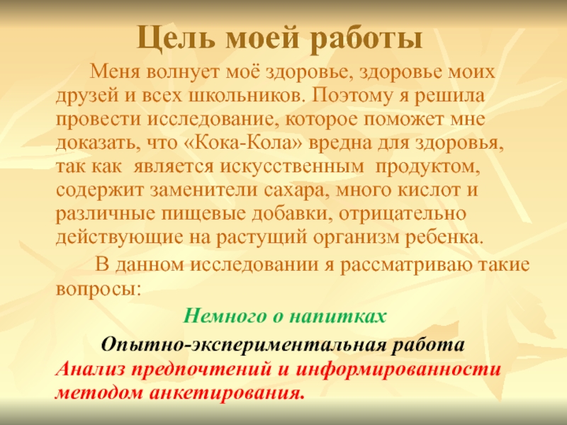 здоровье моих друзей и всех школьников. Поэтому я решила провести исследование, которое поможет мне доказать, что «Кока-Кола» вредна для здоровья, так как является искусственным продуктом, содержит заменители сахара, много кислот и различные пищевые добавки, отрицательно действующие на растущий организм ребенка.
