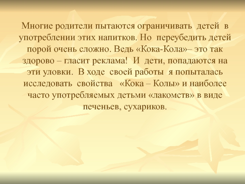 детей порой очень сложно. Ведь «Кока-Кола»– это так здорово – гласит реклама! И дети, попадаются на эти уловки. В ходе своей работы я попыталась исследовать свойства «Кока – Колы» и наиболее часто употребляемых детьми «лакомств» в виде печеньев, сухариков.