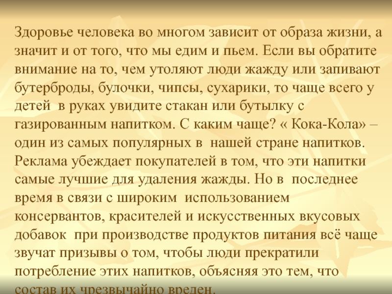от того, что мы едим и пьем. Если вы обратите внимание на то, чем утоляют люди жажду или запивают бутерброды, булочки, чипсы, сухарики, то чаще всего у детей в руках увидите стакан или бутылку с газированным напитком. С каким чаще? « Кока-Кола» – один из самых популярных в нашей стране напитков. Реклама убеждает покупателей в том, что эти напитки самые лучшие для удаления жажды. Но в последнее время в связи с широким использованием консервантов, красителей и искусственных вкусовых добавок при производстве продуктов питания всё чаще звучат призывы о том, чтобы люди прекратили потребление этих напитков, объясняя это тем, что состав их чрезвычайно вреден.