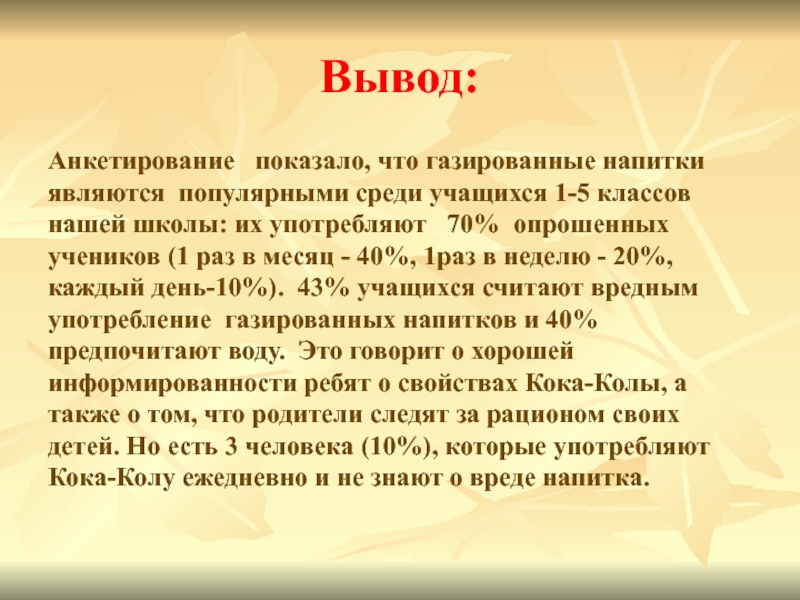 классов нашей школы: их употребляют 70% опрошенных учеников (1 раз в месяц - 40%, 1раз в неделю - 20%, каждый день-10%). 43% учащихся считают вредным употребление газированных напитков и 40% предпочитают воду. Это говорит о хорошей информированности ребят о свойствах Кока-Колы, а также о том, что родители следят за рационом своих детей. Но есть 3 человека (10%), которые употребляют Кока-Колу ежедневно и не знают о вреде напитка.