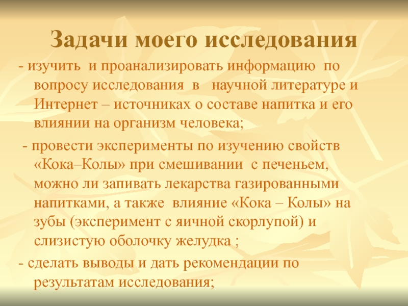 - провести эксперименты по изучению свойств «Кока–Колы» при смешивании с печеньем, можно ли запивать лекарства газированными напитками, а также влияние «Кока – Колы» на зубы (эксперимент с яичной скорлупой) и слизистую оболочку желудка ;