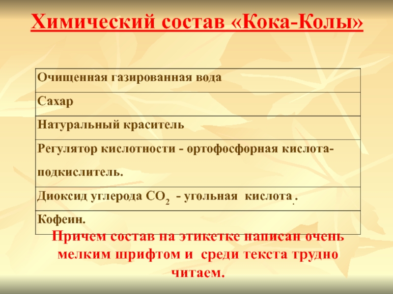 Е-добавок, не все из которых являются полезными для нашего организма. Хочу отметить, что в состав «Кока-Колы» входит кофеин, который возбуждающе действует на центральную нервную систему.