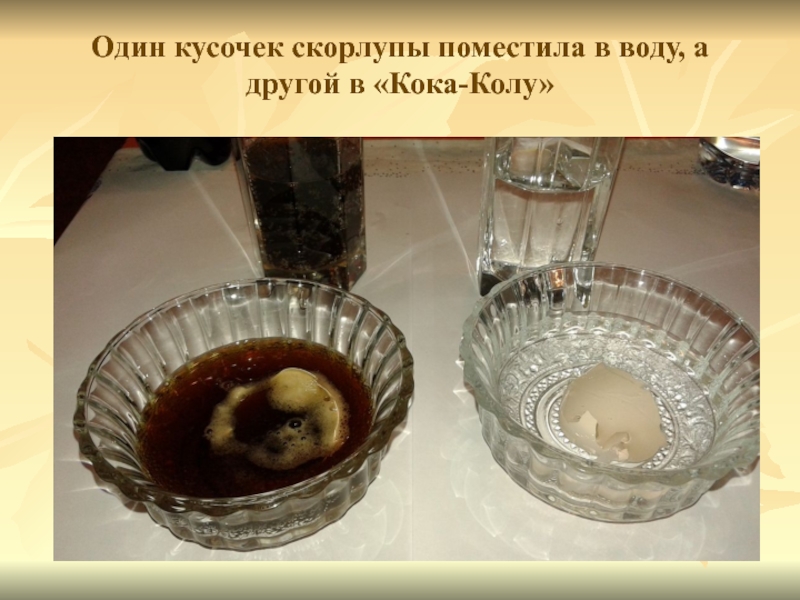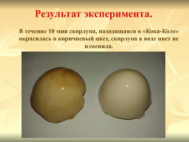 скорлупа в воде оставалась без изменений. Вывод: после употребления «Кока-Колы» возможно потемнение зубов, и вероятно «Кока-Кола» разрушает зубную эмаль.