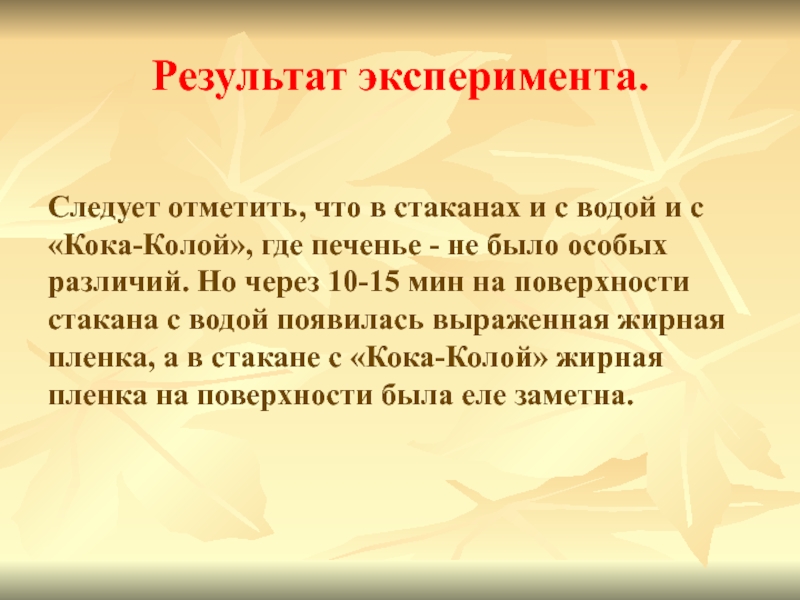 и с «Кока-Колой», где печенье - не было особых различий. Но через 10-15 мин на поверхности стакана с водой появилась выраженная жирная пленка, а в стакане с «Кока-Колой» жирная пленка на поверхности была еле заметна.