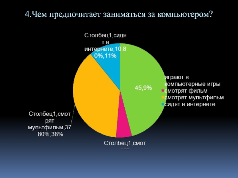 Слайд 104.Чем предпочитает заниматься за компьютером?