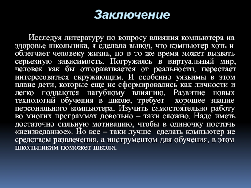 школьника, я сделала вывод, что компьютер хоть и облегчает человеку жизнь, но в то же время может вызвать серьезную зависимость. Погружаясь в виртуальный мир, человек как бы отгораживается от реальности, перестает интересоваться окружающим. И особенно уязвимы в этом плане дети, которые еще не сформировались как личности и легко поддаются пагубному влиянию. Развитие новых технологий обучения в школе, требует хорошее знание персонального компьютера. Изучить самостоятельно работу во многих программах довольно – таки сложно. Надо иметь достаточно сильную мотивацию, чтобы в одиночку постичь «неизведанное». Но все – таки лучше сделать компьютер не средством развлечения, а инструментом для обучения, в этом школьникам поможет школа.