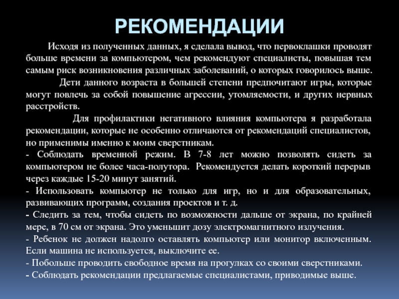Для профилактики негативного влияния компьютера я разработала рекомендации, которые не особенно отличаются от рекомендаций специалистов, но применимы именно к моим сверстникам.