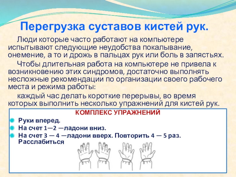 каждый час делать короткие перерывы, во время которых выполнить несколько упражнений для кистей рук.