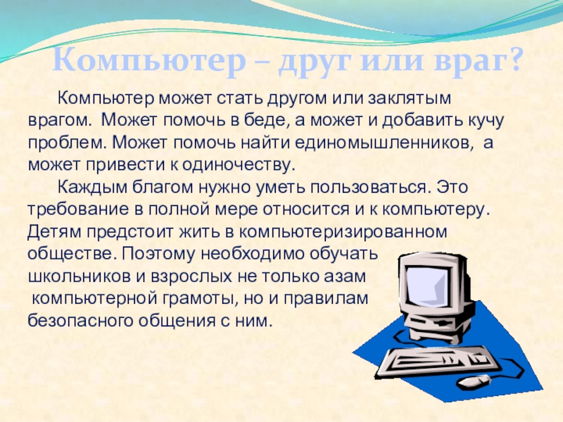 Слайд 2 Компьютер может стать другом или заклятым врагом.