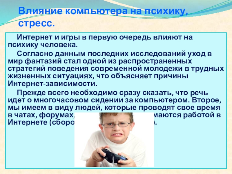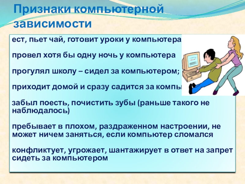 Прежде всего необходимо сразу сказать, что речь идет о многочасовом сидении за компьютером. Второе, мы имеем в виду людей, которые проводят свое время в чатах, форумах, за играми, а не занимаются работой в Интернете (сбором информации и т.п.).