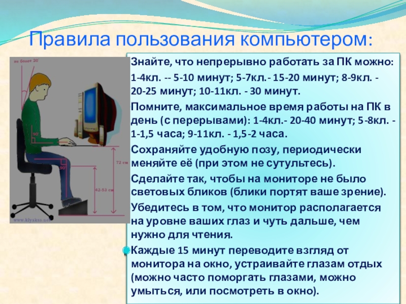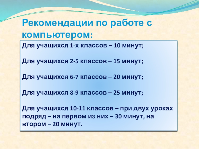 Помните, максимальное время работы на ПК в день (с перерывами): 1-4кл.- 20-40 минут; 5-8кл. - 1-1,5 часа; 9-11кл. - 1,5-2 часа.