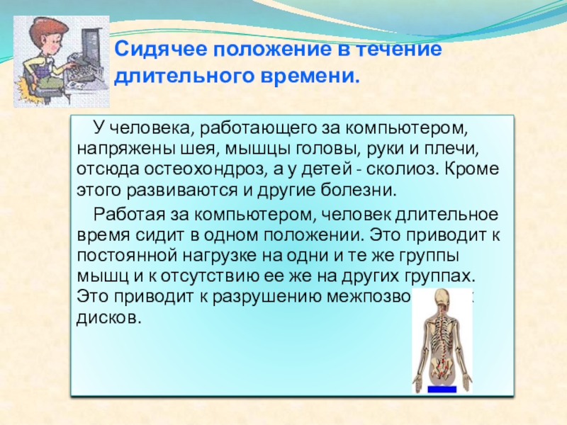 Работая за компьютером, человек длительное время сидит в одном положении. Это приводит к постоянной нагрузке на одни и те же группы мышц и к отсутствию ее же на других группах. Это приводит к разрушению межпозвонковых дисков.