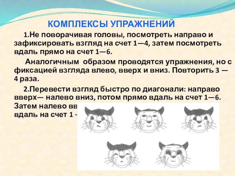 2.Перевести взгляд быстро по диагонали: направо вверх— налево вниз, потом прямо вдаль на счет 1—6. Затем налево вверх — направо вниз и посмотреть вдаль на счет 1 —6. Повторить 4 — 5 раз.