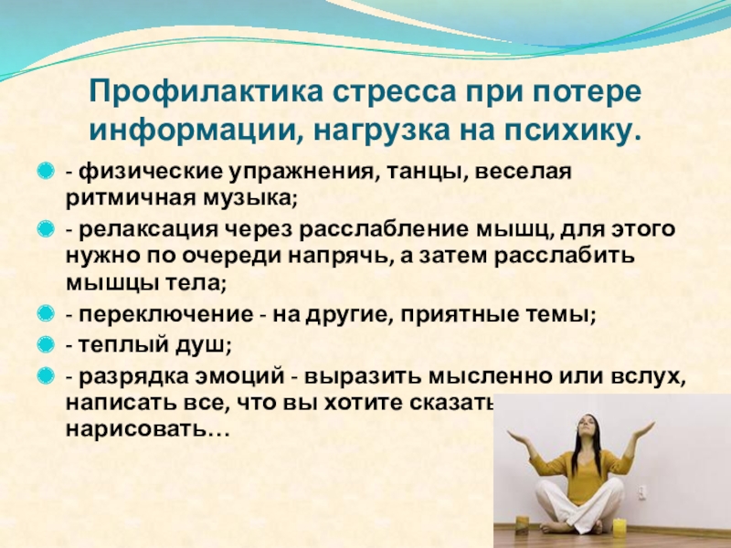 Слайд 16Профилактика стресса при потере информации, нагрузка на психику.