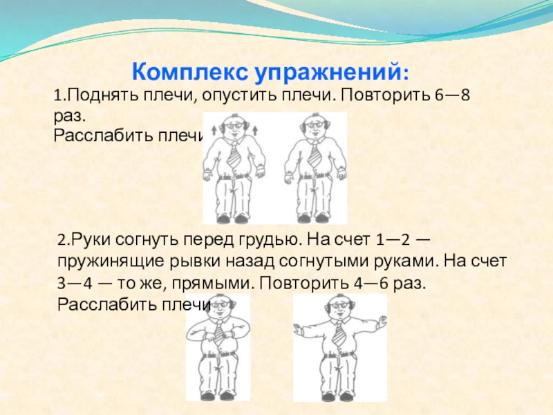 1.Поднять плечи, опустить плечи. Повторить 6—8 раз.