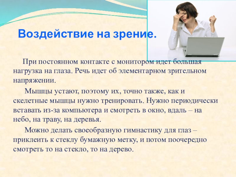 большая нагрузка на глаза. Речь идет об элементарном зрительном напряжении.