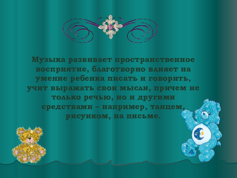 Слайд 13Музыка развивает пространственное восприятие, благотворно влияет на умение ребенка писать и